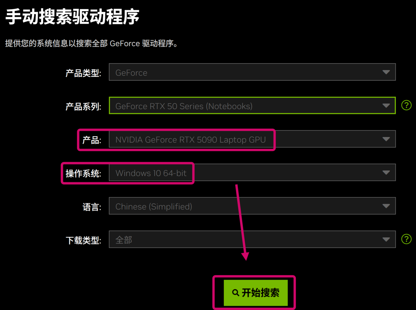 在下拉菜单中精确选择你的显卡产品系列(如GeForce RTX 40 Series)、型号(如GeForce RTX 4070)、操作系统等信息。