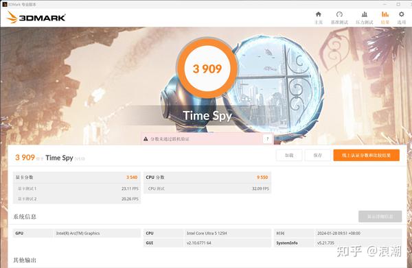 Intel Arc 112EU核显在TimeSpy跑分中可以达到3500分左右,相比上代翻倍提升,比AMD的Radeon 780M强一点点,可以低画质60帧左右玩吃鸡、古墓丽影、原神等大型游戏。