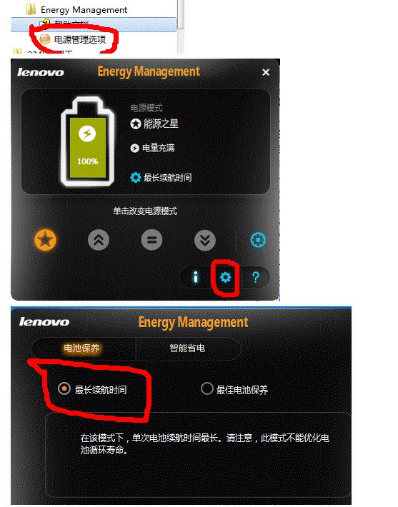 如果在这里设置为电池养护模式,同时是充到60%左右就会停止充电,所以请务必确认电池的充电模式是否正确。一定要选择正确的电池使用模式否则是无法充满的。操作方法:点击电脑左下角的开始 - 所有程序 - LENOVO - Energy Management - 电源选项 - 选择最长续航时间。