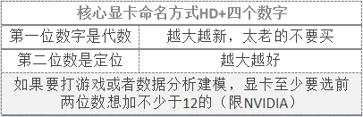 核心显卡:使用最多的显卡,集成在CPU中的显卡现在大多达到低端独显的水平,可以满足多数普通工作者的需求。型号为HDXXXX,看下面图是核显命名规则。
