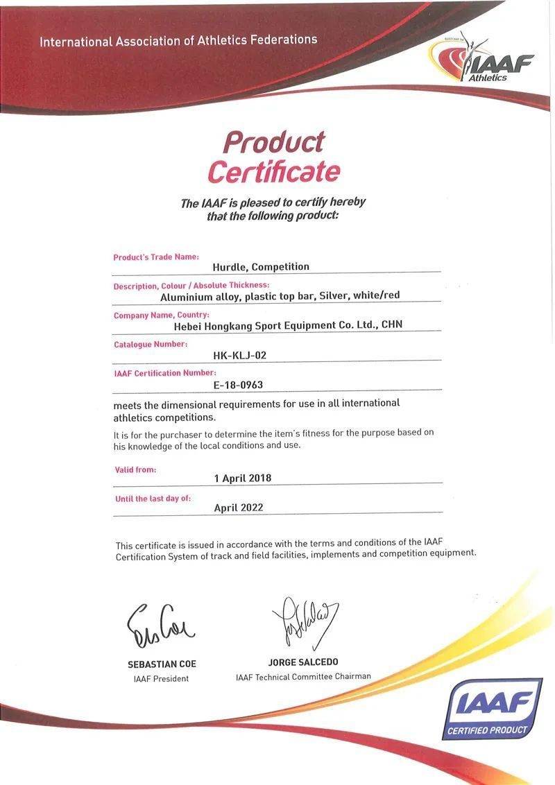 国际田联认证国际田径联合会(International Association of Athletics Federations,IAAF),简称国际田联颁发。IAAF比赛规则要求,只有经过IAAF认证的场馆及设备才可用于国际田径比赛。目前,我公司HK-CGTCD-01撑杆跳插斗、HK-KLJ-02高档跨栏、HK-KLJ-03中档跨栏、HK-TZQ-01投掷圈、HKLJ-020铁饼、HKTJ-017起跳板、HKTJ-019起跑器、HKTJ-030场地道牙等16款产品获得国际田联认证。