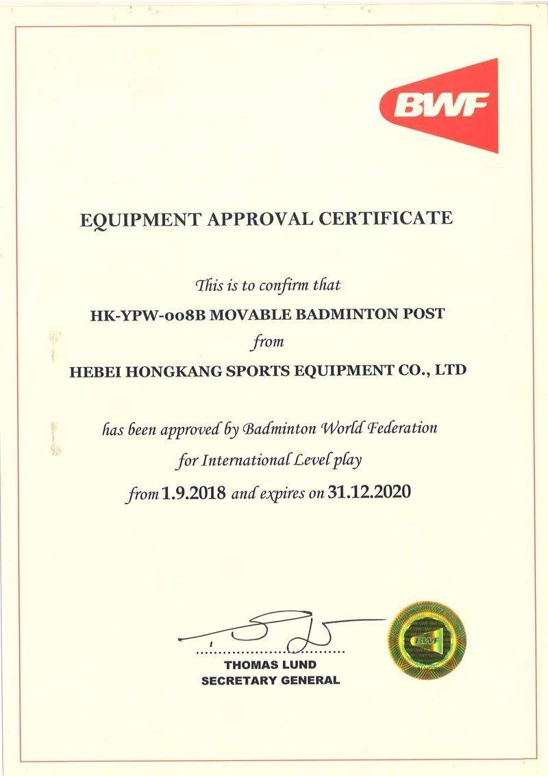 展开全文国际羽联认证由BWF(Badminton World Federation)即国际羽毛球联合会颁发。BWF 技术规范要求只有通过 BWF 认证的羽毛球,羽毛球球网,场地地板等才可用于国际性羽毛球比赛。目前,我公司HK-YPW-005 移动式羽毛球柱、HK-YPW-005 移动式羽毛球柱、HK-YPW-008B 移动式羽毛球柱三款羽毛球柱获得国际羽联认证。