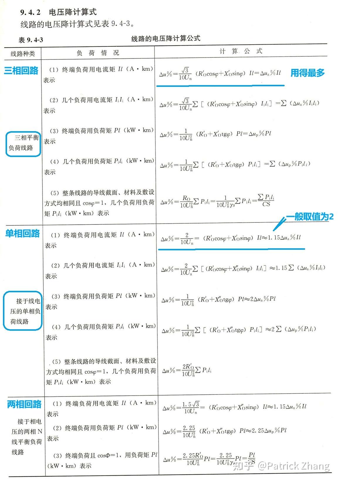图2:《工业与民用供配电设计手册》第四版中给出的计算线路压降的公式图2中,第一个公式用得最多,是电气工程师们和电工们最常用的公式:
