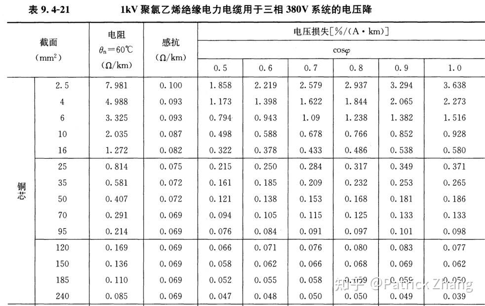 图3:配四中给出的铜芯电缆电压降表我们设负载处运行态的功率因数是0.8。按题主的意思我们选取截面积为10mm²的电缆,我们看到图3中10mm²栏和0.8栏交点处的数值是 ΔU_0\%=0.766\% 。
