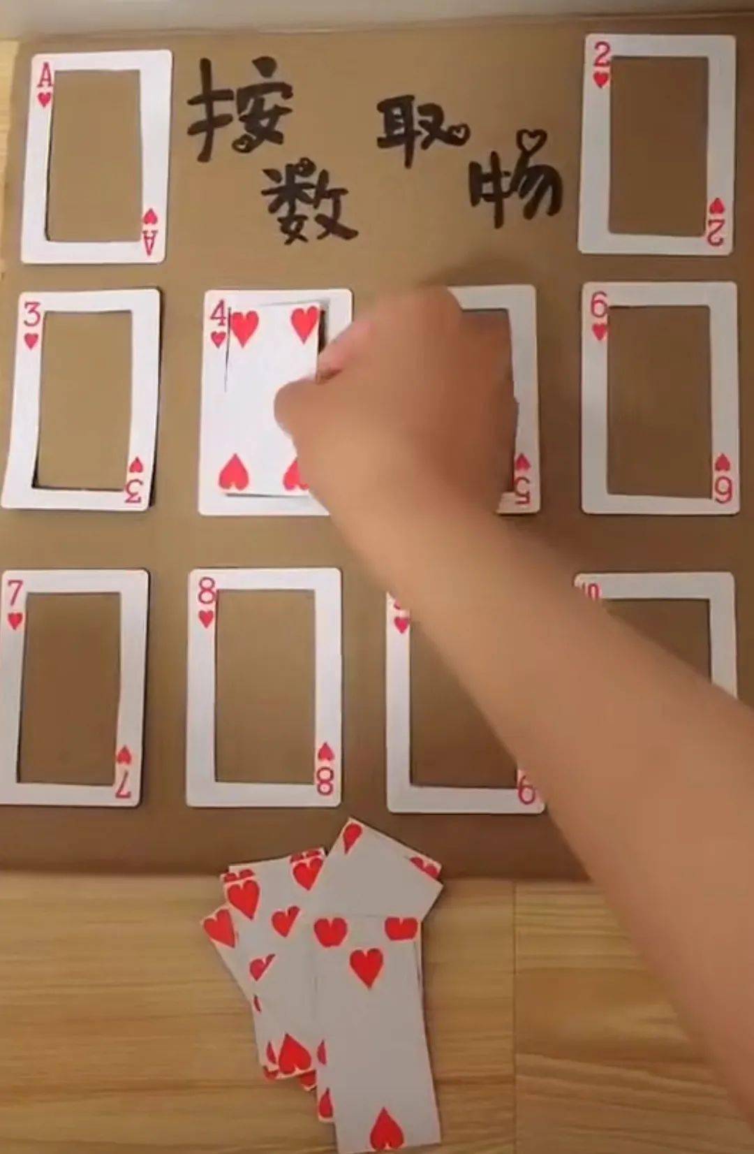 将一副扑克牌中间的图片部分裁减掉备用,然后把数字框粘贴在硬纸板上,让孩子按照框上的数字,取出对应的图片放置在框内。