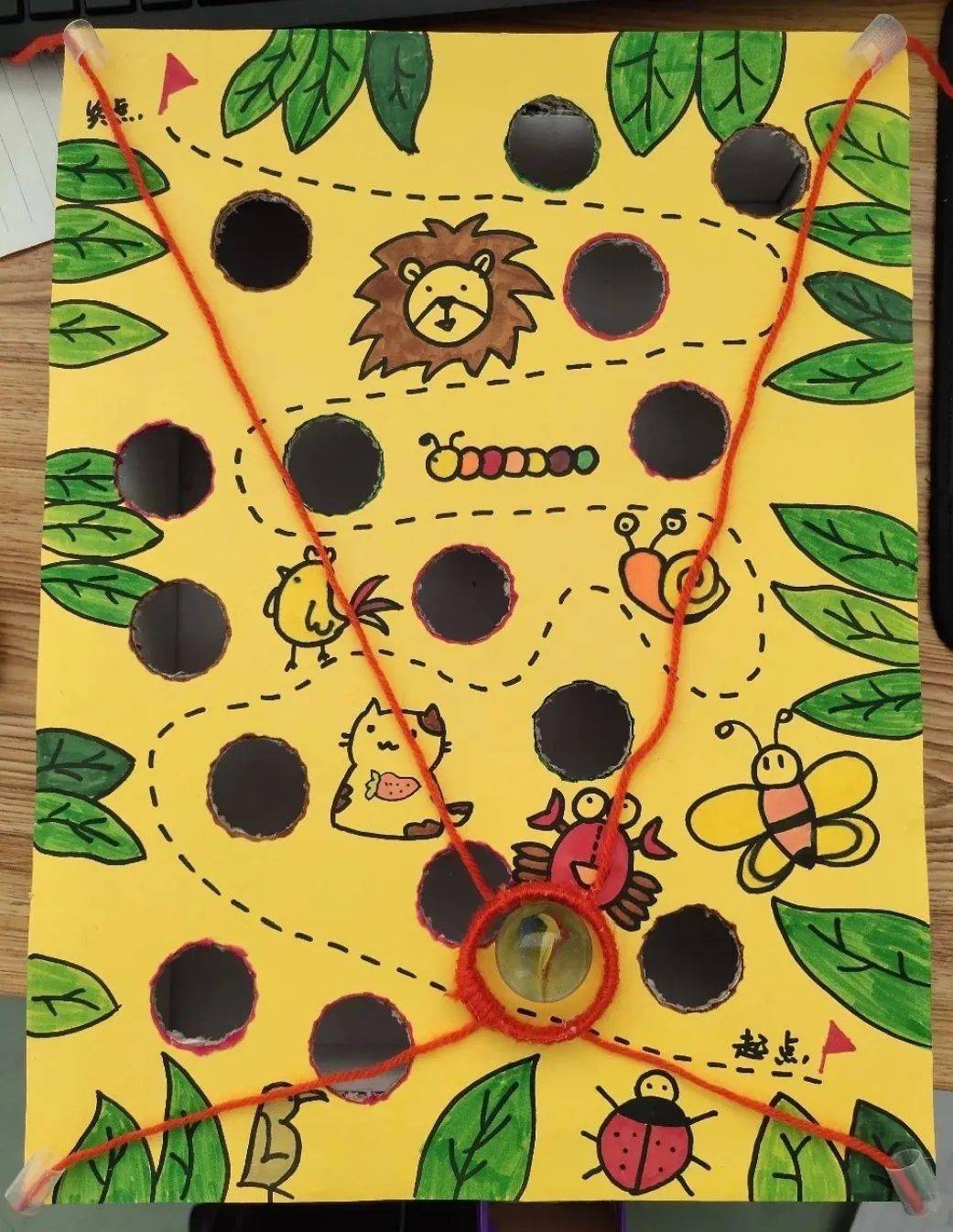 在卡纸上画上丛林的地图,有植物和小动物们,画上起点到终点的线路,在线路两边画上众多陷阱,通过拉动绳子将小球从起点运送到终点,不能落入陷阱哦!