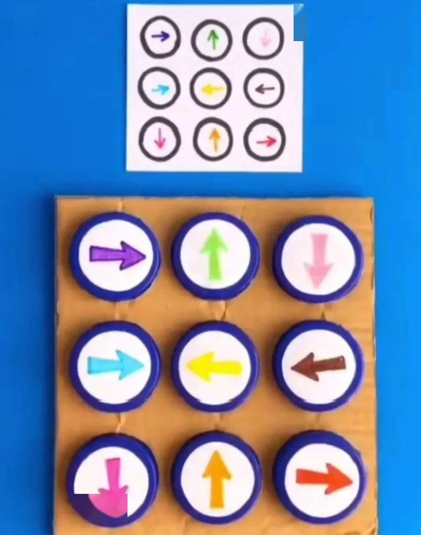 老师画几张不同颜色和不同方向箭头的示意图,让孩子通过观察,将瓶盖摆放到对应的位置上。
