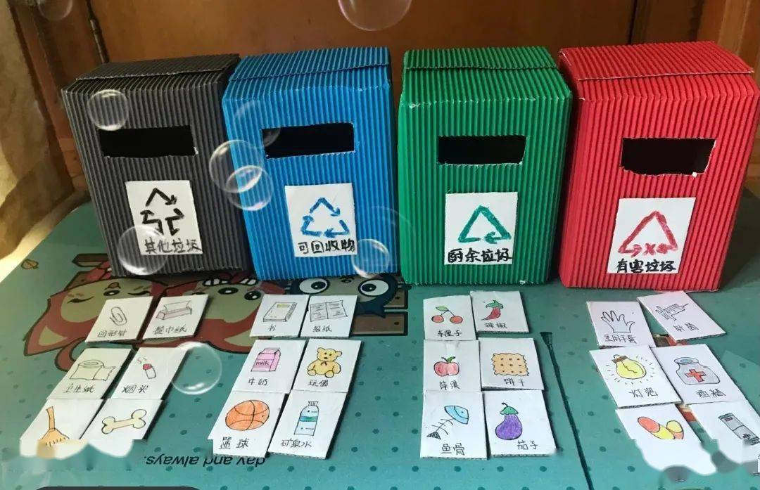 保护环境,从小做起!自制垃圾分类手工玩具,制作四个不同分类的垃圾桶:其他垃圾、可回收物、厨余垃圾、有害垃圾。