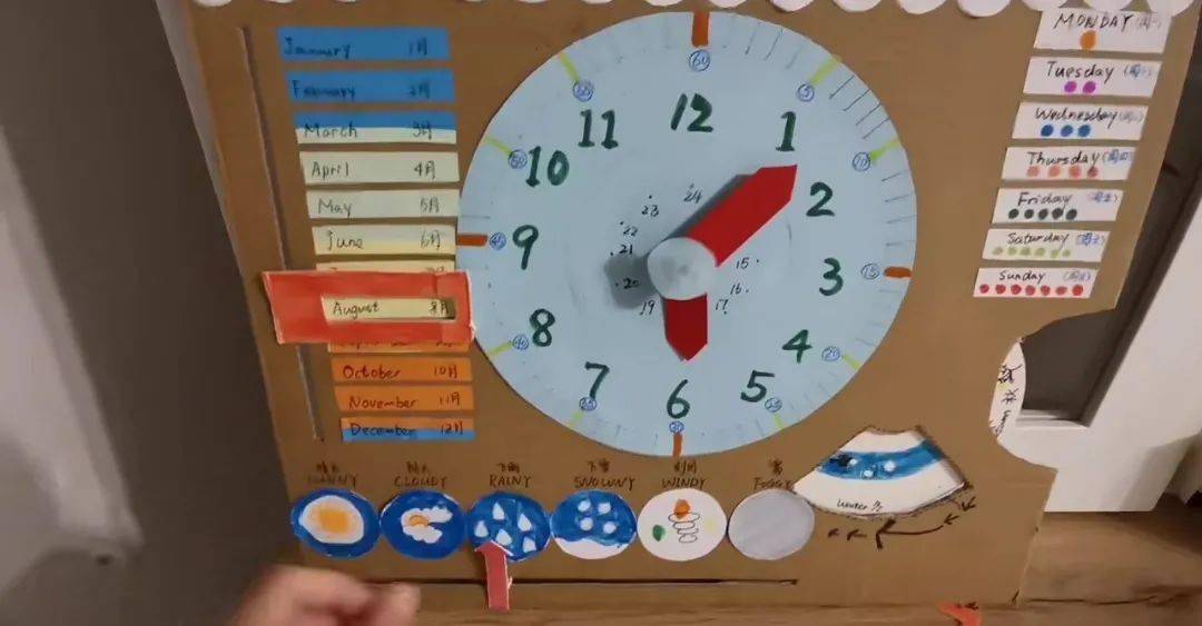 用木质板制作时间认知板,认识时钟和四季,让孩子把月份、星期、四季、日期以及时间之间的关系串联起来,这样认识时间的方式真是太有趣了~
