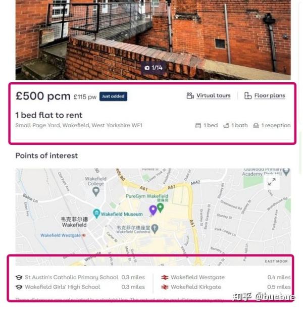 例如:500/pcm/ 类型 bed flat /地址 Small page Yard,Wakefield,West Yarkshire WF1 /设施:one bed/ one bath/ a reception等等,都是非常经典的租房信息话题答案。
