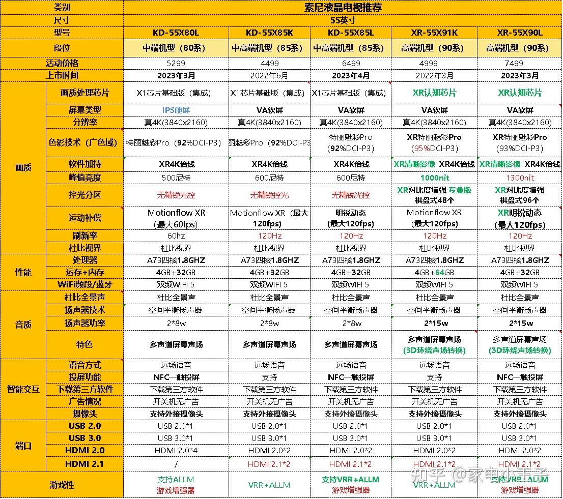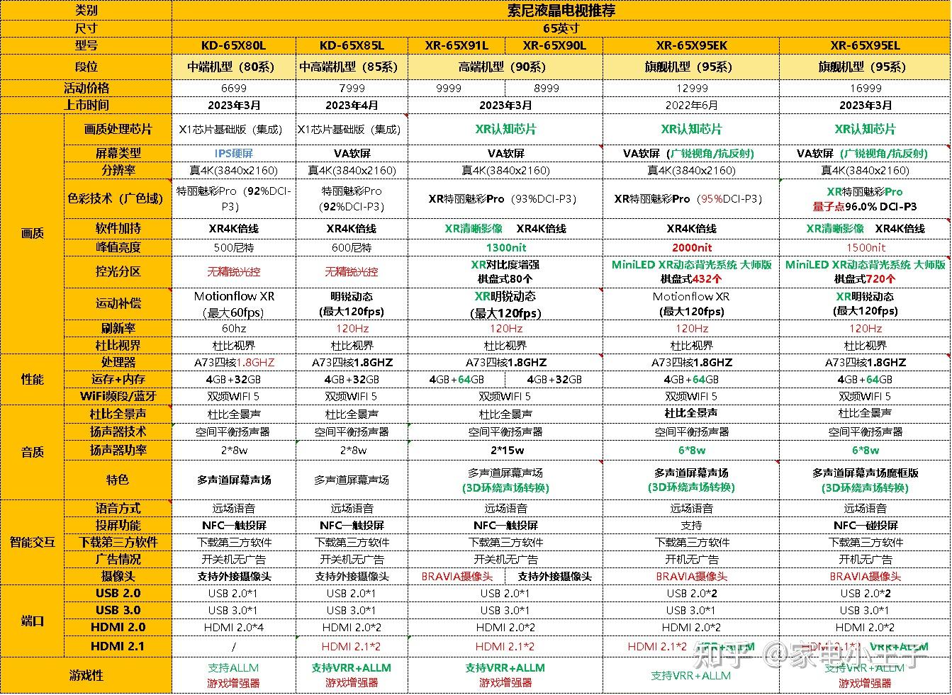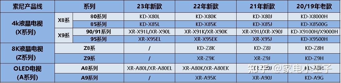 X80系列,索尼入门级中端电视,性价比相对于这么多系列来说性价比不算高,但是最便宜。X85系列,索尼中高端电视,和更高段位高端X91差价没差多少的,直接选后者X91系;差价差的大,预算有限,可以考虑X85。市场调研数据,出货量最大的,画质又属于高端机型的,就选X91L/X90L;对画质要求进一步提升的4K液晶电视,就选X95EK/X95EL;已经看不上液晶电视的音画质了,预算也充裕,那就选OLED中相对性价比还挺高的A80系列;钱多土豪想要最极致的画质体验,好了直接All in ,上索尼画谛系列的OLED电视A95K。