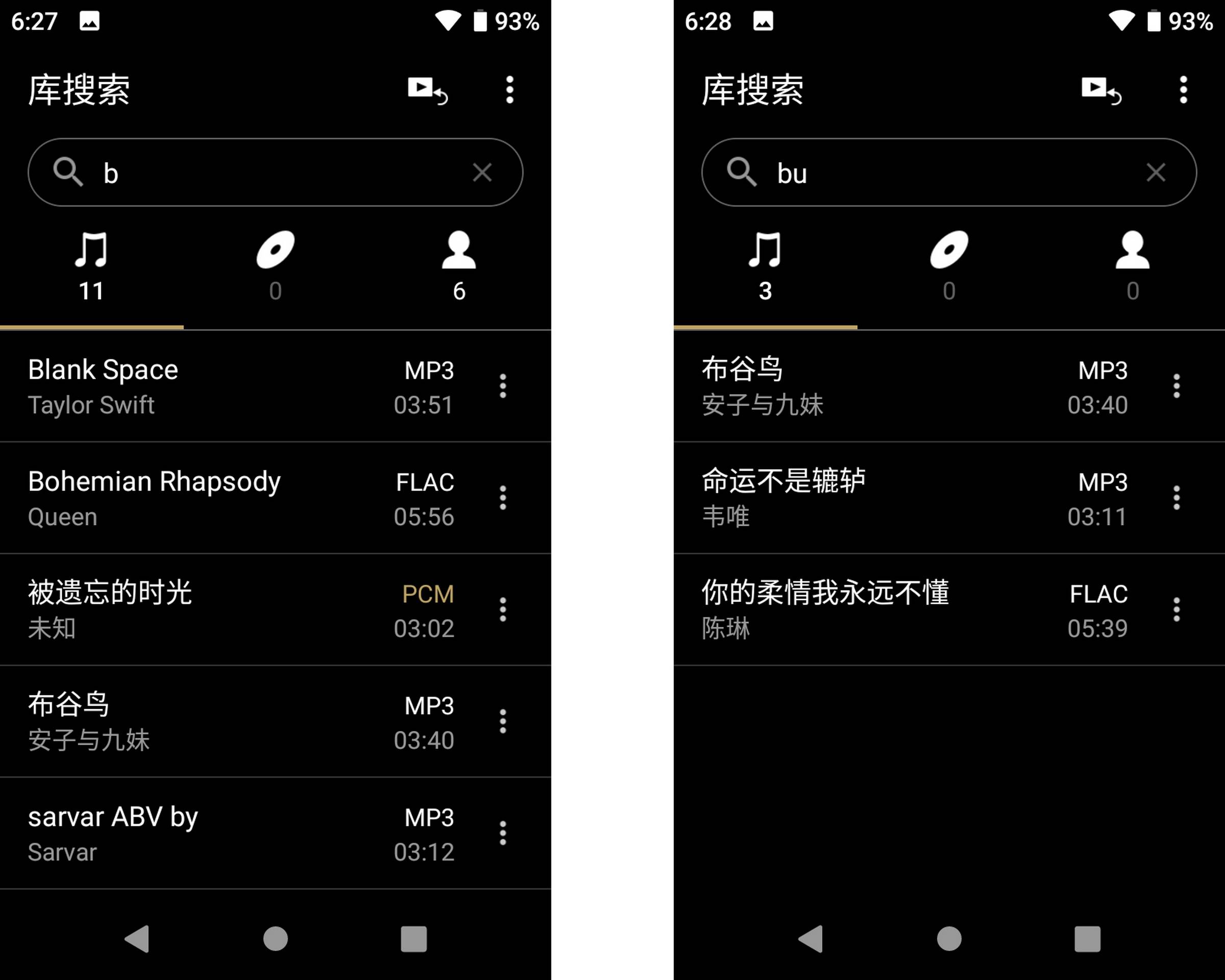 在曲库搜索上新系统增加了“拼音模糊搜索”功能,可通过歌曲名中任意一个汉字的拼音甚至是汉字拼音的首字母检索出曲库里全部的相关曲目,这个功能极其强大,堪比Android手机上通过拨号键盘打拼音查找通讯录,用起来简直太方便了,尤其对于本地存储了很多音乐的用户。而升级前想要搜索曲目就必须输入正确的汉字或字母,和升级后没法比。
