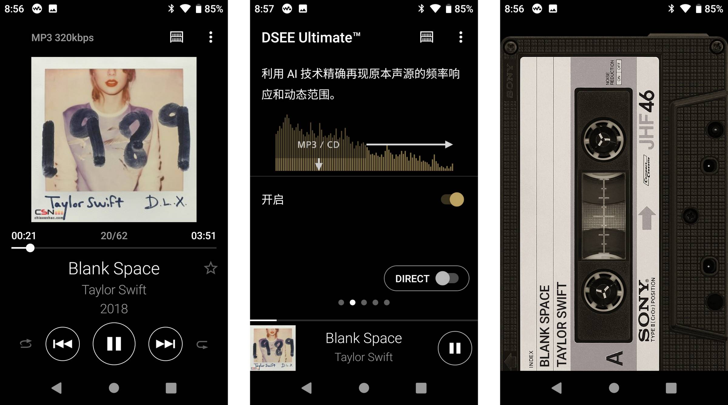 为了验证DSEE Ultimate的真实表现我听了大概三十多首曲子,限于篇幅原因这里只挑典型的说说。《Taylor Swift:Blank Space》相信没有人不熟悉吧,这首相对简单的曲子以前听过很多次,从DSEE HX升级到DSEE Ultimate再听,声音的信息量有了明显的增加,主要集中在中高频段,包括人声也有了细微的变化,变得更加亮了,光泽感更突出。如果用数字来量化,关闭的情况下假设音质是7,那么DSEE HX就是9,DSEE Ultimate就是9.5,这么说能理解了吧。