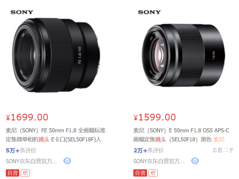同样是50 1.8,左边FE是全画幅镜头,右边E是APS-C镜头