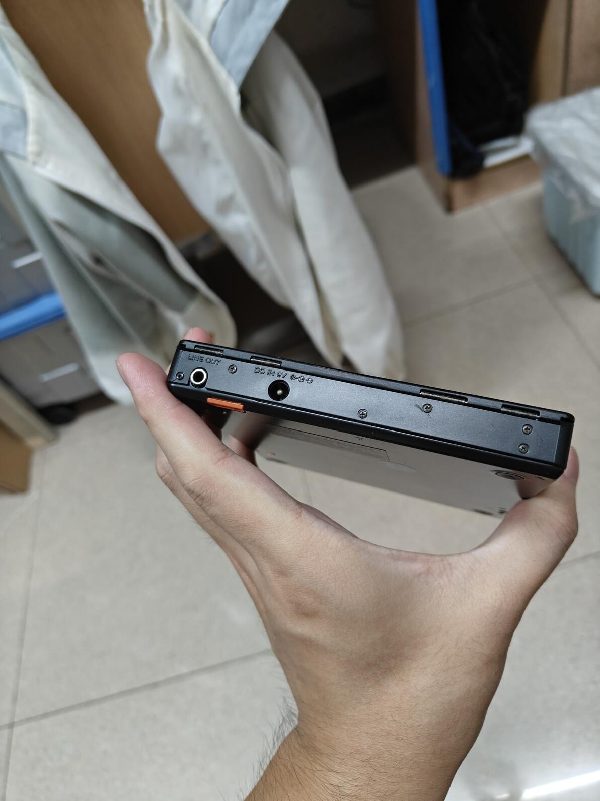 上盖是经典的阳极氧化工艺,Discman的logo是简单印在上面的,容易有磨损。Logo右侧有个小窗可以看碟子转动。左下方open键周围有一圈三角形的装饰片,是直接用胶粘上去的,容易脱落。本文章由刷厕所的老黄原创。