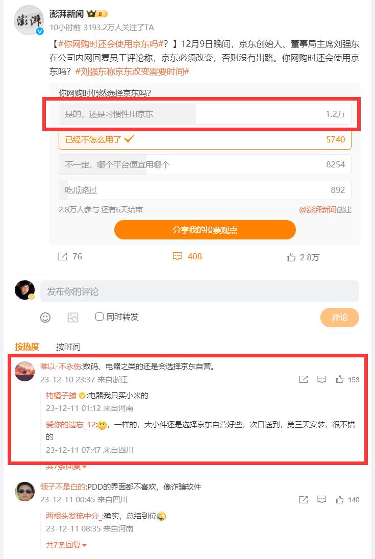 在澎湃新闻发起的问卷调查中,“你网购时还会选择京东吗?”选择“是的,还是习惯性使用京东。”的选项是最多的。而点赞最高的评论是“数码、电器之类的还是会选择京东自营。”