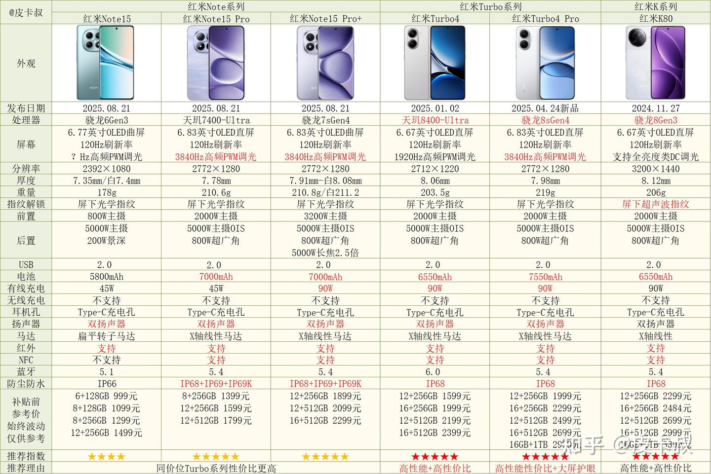 红米各个系列定位:K系列>Turbo系列>Note系列>数字系列。红米Turbo系列的性能和性价比较高,老款K系列通常也会降价到千元机价位。而红米数字系列过于低配,全系为4g手机,没有快充,古董级micro接口,固排除数字系列。