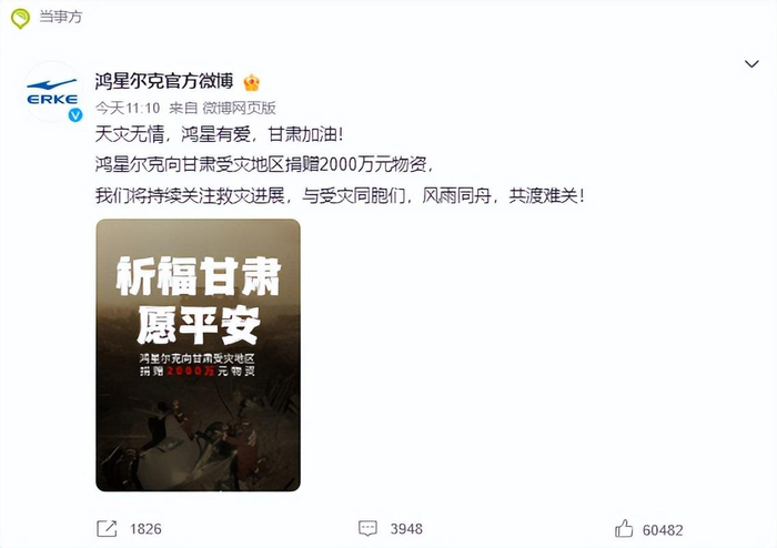 要知道,在之前的河南暴雨灾害,几乎快消声灭迹的鸿星尔克,大手一挥,直接捐款5000万,可谓是一夜爆红,引发无数网友的野性消费,鸿星尔克也从一个过气的国货运动品牌,瞬间逆袭成为了直播电商领域的顶流品牌,如今的甘肃地震,他们依然秉持初心,不忘感恩,拿出2000万元物资,第一时间送到灾区,力争解决燃眉之急。