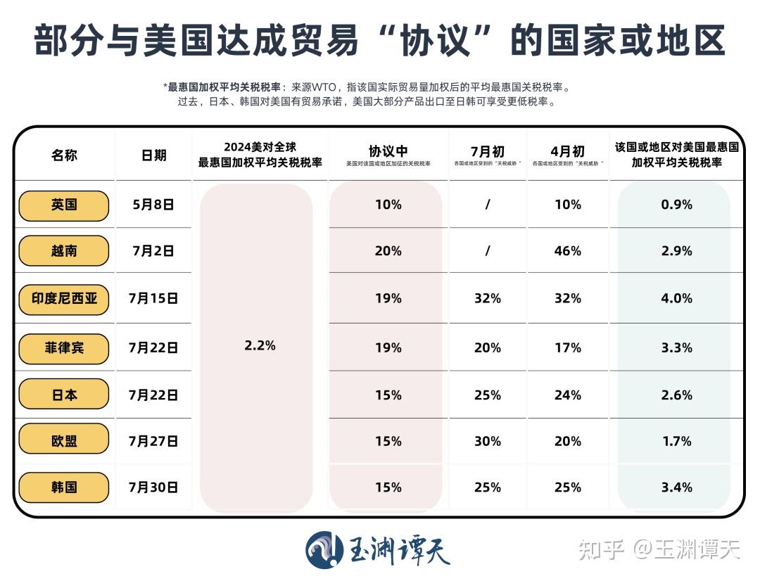 这些达成协议的国家所面临的关税,相较于4月2日美国实施的“对等关税”,确实是降下来了。但如果跟今年以前的状态比,还是高了不少。