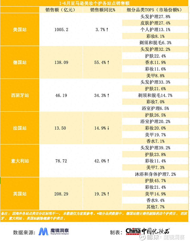 1月-6月,亚马逊法国站(美妆)销售额13.50亿元,同比下降14.9%。销售额前五的类目分别是皮肤护理、身体护理、彩妆、美甲、香水。