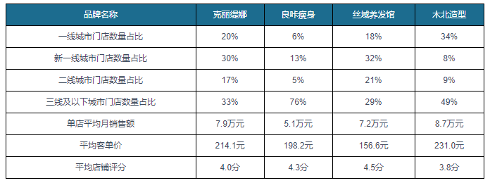 根据行业部分品牌情况对比情况来看,美容方面,克丽缇娜各线城市门店布局较为均匀;良咔瘦身则是发力于低线城市,其三线及以下城市门店数量占比达到七成以上。美发方面,丝域养生馆各线城市门店布局较为均匀;木北造型则是两端布局,其一线城市门店数量占比为34%,三线及以下城市门店数量占比为49%。