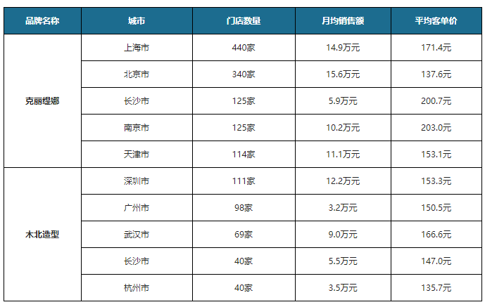 从克丽缇娜和木北造型这两个品牌城市门店布局情况来看,克丽缇娜在上海市的门店数量较多,有440家;在北京市的平均客单价较低,为137.6元;北京市月均销售额最高,为15.6万元。木北造型则是在深圳市的门店数量和月均销售额较多,在杭州市的平均客单价较低。
