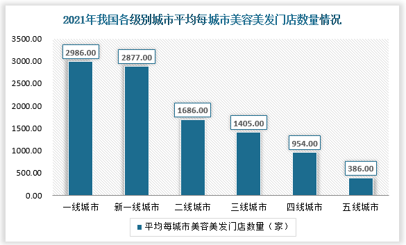 从区域竞争来看,我国一线、新一线城市平均每城市美容美发门店数量较多,其中一线城市平均每城市美容美发门店数量约为2986家。另外,平均每城市美容美发门店数量是随着城市级别的降低而逐渐减少,其中五线城市平均每城市美容美发门店数量约为386家。