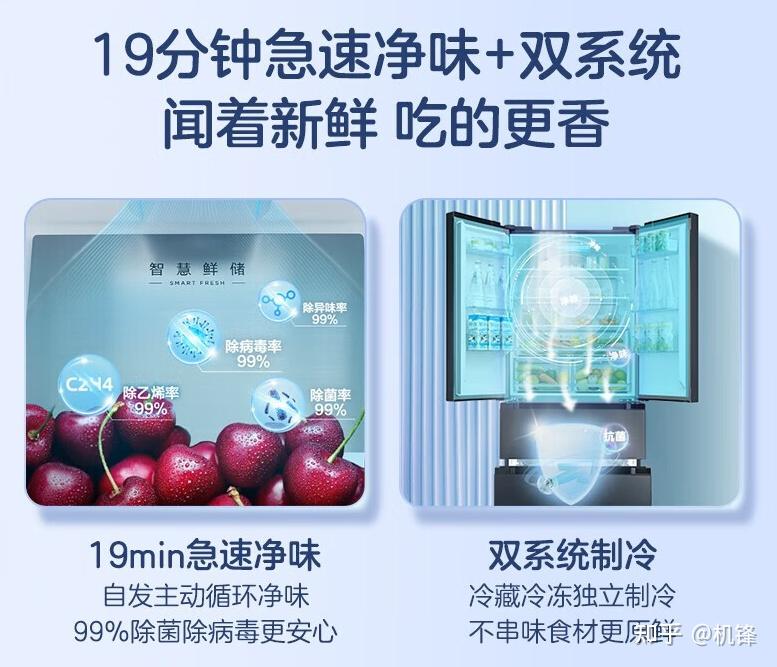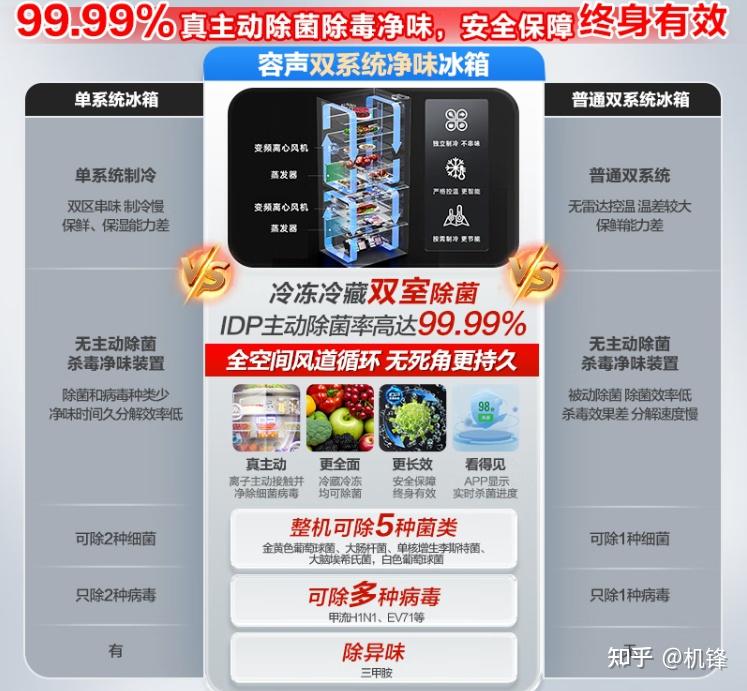 虽然说冷冻室温度低,舱室内空气细菌、病毒很少,即便是有,活性也被抑制了。但冷冻室里的鱼虾、咸鱼腊肉,各种异味肯定是有的,配置主动除菌净味的冷冻室,它的异味会少很多,各种食材串味的概率也会降低。所以冷冻室有除菌净味模块优于无除菌净味模块的机型,有主动除菌净味技术的机型优于被动除菌净味技术的机型。市面上双舱均搭载主动除菌净味技术,基本上也只有容声。