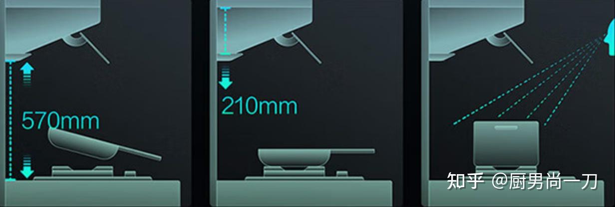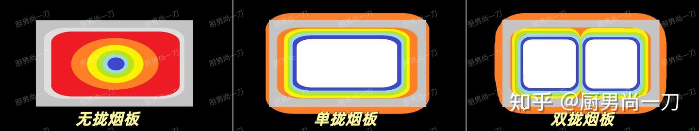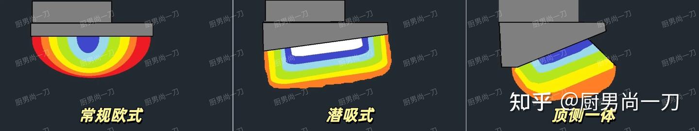 厨男在第一章分析过,超薄近吸的负压区离烟源近,捕获油烟效率高,但是颠锅时油烟可能会冲出负压区,从而向上扩散,对于扩散到顶部的油烟就完全没有办法。