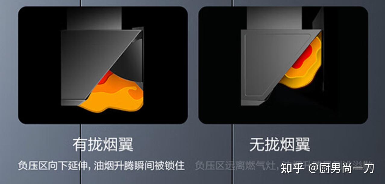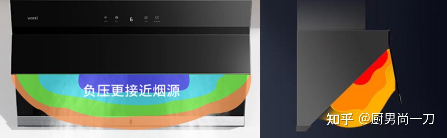 悬浮拢烟板的侧吸式,相当于没有拢烟腔,向上升腾的油烟很容易冲出负压区。