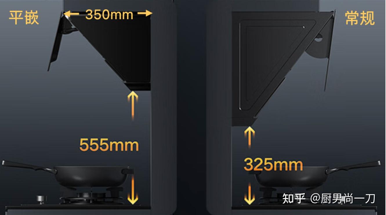 平嵌侧吸就是在常规侧吸的基础上缩减了高度,与台面的距离跟上面介绍过的顶侧一体差不多,宽度上与常见的橱柜尺寸一致,齐平的安装方式,既避免了遮挡视线,又兼顾了装修美观。