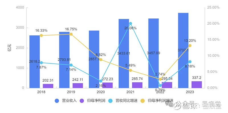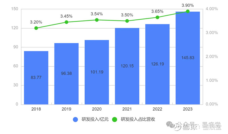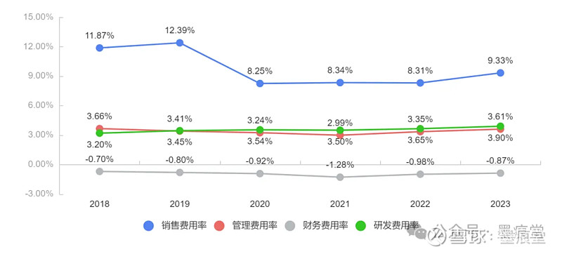 公司的销售费用率在2020年有个较大的降幅,之后一直保持在10%以内。对于三千多亿的营收来说,销售费用绝对额已经不小了。管理费用随着营收增长同步增长,增速也没有超过营收增速,是正常现象。财务费用由于公司存在大量资金沉淀,每年会获得1%营收的利息收入。研发费用率整体变化不大,但是随着营收净额的增加,每年的研发投入已经增加到百亿之上。