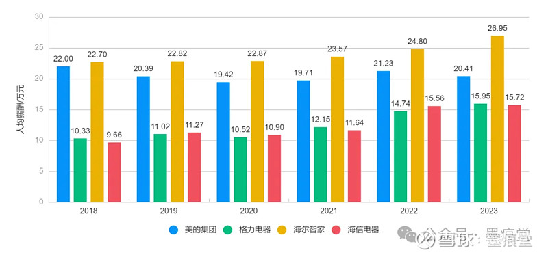 在做统计数据时,顺便统计了一下四家公司的人均薪酬。结果还是挺让人意外的,一方面家电公司确认提供了大量就业岗位,例如美的的全球职工已经接近20万了,格力没有国际化也有7.2万,海尔11.2万,给这些家庭提供了一份足以养家的工作。但是具体到各家公司的税前薪酬,青岛海尔最为良心,年薪一直在22万以上,员工实际到手大约70%,也就是差不多月薪1.2万元。美的属于第二高的,但是最近六年的平均薪酬不仅没有涨反而是下跌的,作为美的员工应该没有那么多幸福感可言,何况在佛山消费也不算低。而号称对员工多么好的格力可以用寒碜来说,2018年的平均薪酬才10万出头,到手月薪6k,去年涨到16万,到手月薪也没过万,就这董事长还要求员工感恩戴德,简直是迷之自信。