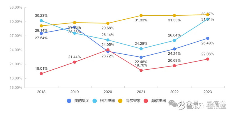 公司毛利率在2021年触底,去年已经回升到26.5%,但是离之前接近的30%还有距离,同样的格力和海尔都有超过30%的毛利率,这对于制造业来说确实不易,但是争取一下提高3%的毛利率将给美的带来近百亿的毛利润,相信这也公司高层不断努力的方向。相比之下,海信比其他三家就逊色不少。