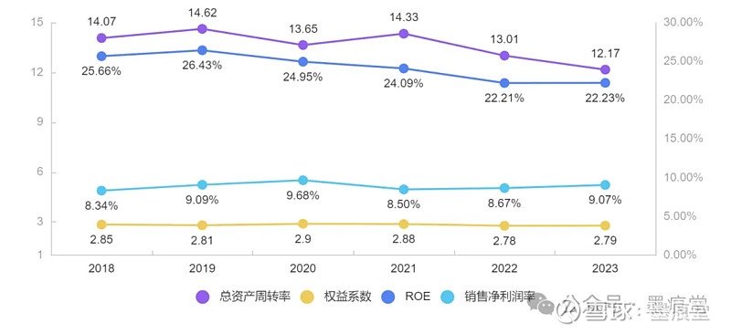 最近五年来,美的的ROE是逐年下滑的,伴随着大量现金沉积无项目可投只能躺在银行吃利息,将来除非出现大项投资消耗掉或者分配股利,否则ROE要重回增长挺困难。因为公司的净利润率已经回归到仅次于2020年的高点,但是总资产周转率下滑以及权益系数的稳定阻止了ROE的提升。