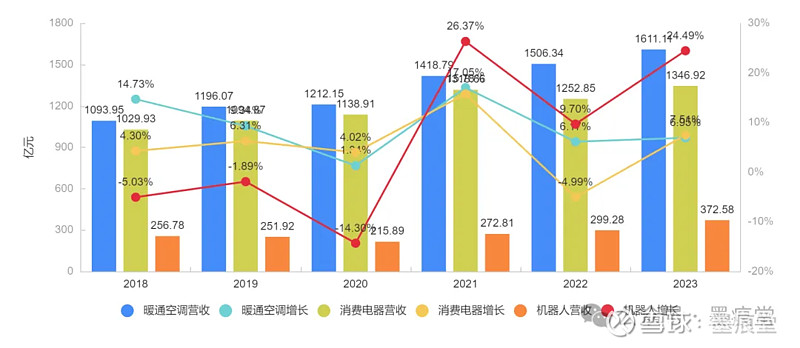 按财报的拆解,美的分为暖通空调、消费电器以及机器人三大块。其中暖通空调近两年的增长率低于10%,营收占比43%;家用电器近几年增速均较低,2022年还出现了短暂下滑,最新营收占比36%;工业机器人在2018-2021年连续三年负增长,最近三年又出现较高的增长,和产能置换更新的周期性有较大关系,但其占比还是不足10%,且在强敌环伺的环境中如何寻找突围机会将是未来的重点工作。总体营收的年化增长率不足10%,这是在外部收购整合后实现的业绩,可见对于其所在的行业已经是相当成熟且稳定的行业,想获得长足的扩张不仅需要管理层每日兢兢业业,还需要一定的契机,不论是并购还是出海。