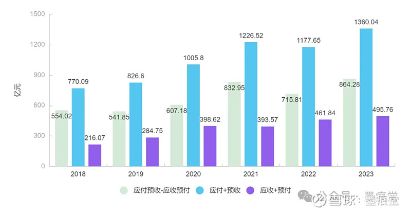 美的通过占用上下游的货款形成了强大的资金池,差额达到了864亿,这些款项长期留在公司账户上供调度使用,增加了公司实力。应付预收款已经接近1400亿了,而这些货款最后会以货物价值来兑现,无需真正还款。可见集团做大了之后的强势地位,由于公司的货品容易售卖,对于每一家供应商和经销商来说,相当于都质押一笔款项循环使用。