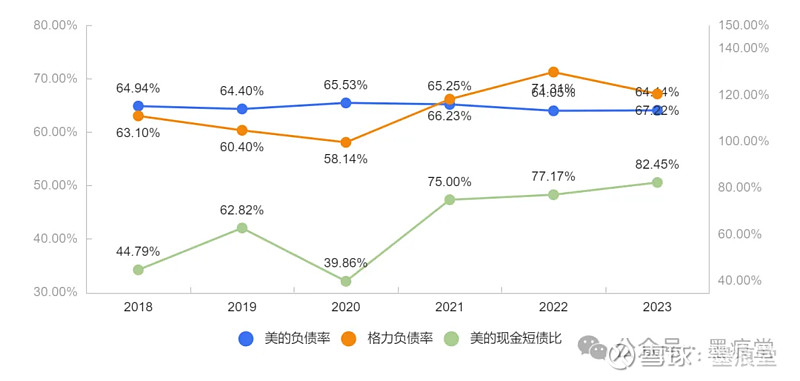 整体负债率方面,美的一直较为稳定,格力的负债率波动略大,它们都有提供销售返利的政策,和这类经营性负债调节有一定关系,对于实际的财务其实毫无压力。美的的现金短债比这几年逐步提升,账面余额加上固收类权益资产足以覆盖既有债务,再者以公司目前的盈利能力,假如需要周转资金的话绝对属于银行VVIP客户。