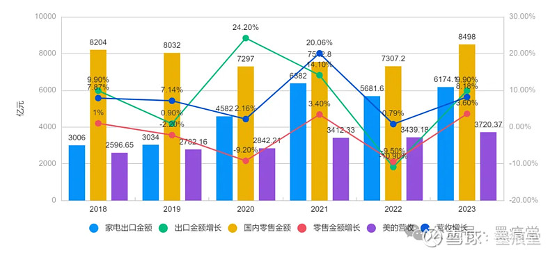 整个家电出口市场除了2022年受公共卫生事件影响大幅下滑之外,其他年份都是稳步增长的。而国内的零售市场一直处于微增长或下滑的境况,说明国内市场规模已经基本见顶了,而美的的总体营收是不断增长的,其海外业务大致占比40%,这是通过不断蚕食竞争对手得来的市场份额增加。由于家电市场已经是几个巨头所垄断,想要逐步从对手的锅里夺食也是不容易的,行业的集中度也是在不断提升中。
