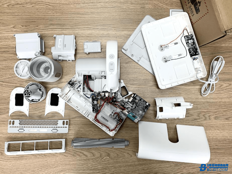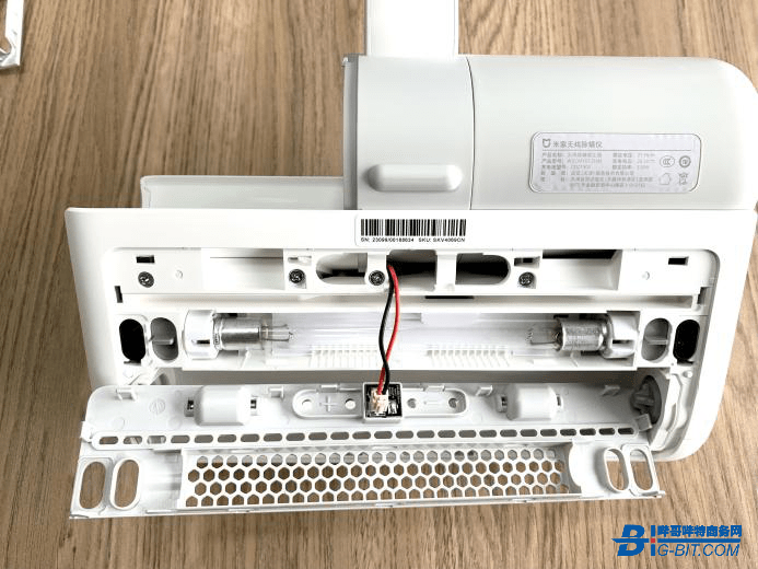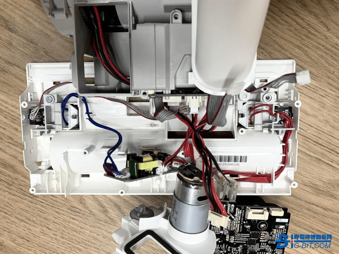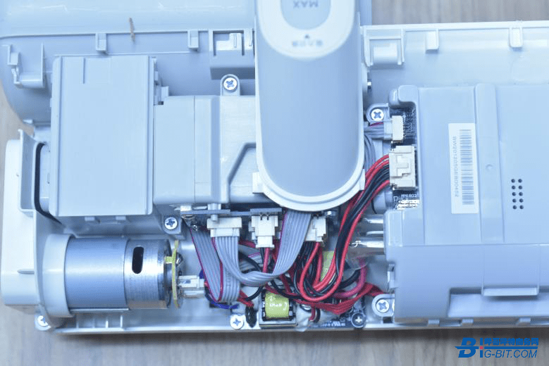 其次,半导体器件应用网在拆解过程中对该产品的高效性有了进一步的了解:其一,米家除螨仪为了考虑更快速更有效率地解决用户痛点,在超大吸力上使用可达16000Pa大吸力的无刷电机,搭配上紫外线UV灯、大幅度拍打,对棉物用品上的细菌进行更加彻底的吸除;其二,为了方便用户使用,利用体积小、功耗低且控制能力强的核心元器件(如单片机等),来完成性能增强的同时,兼顾便携式无线的设计;其三,在电机、电池和控制装置上布局紧凑且有序(如电池处的泡棉,为了与其他结构部件进行软接触,防止电池松动或移位)。另外,在这三处地方皆设置散热板和散热孔,解决了产品使用的体验性与流畅性问题。