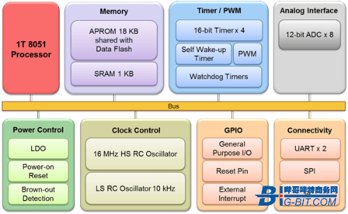 特点:该款器件为新唐高速1T 8051 单片机系列产品,提供18 KB Flash ROM、可配置Data Flash与高容量1 KB SRAM,支持2.4V 至 5.5V宽工作电压与-40℃至105℃工作温度,并具备高抗干扰能力 7KV ESD/4KV EFT。