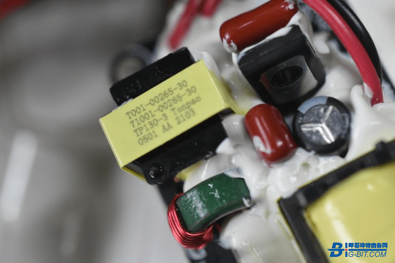 在主控保护电路方面,新唐科技单片机用于无线充电主控,具备高集成,高抗干扰能力,且有效简化外围电路器件设计;左右两颗德州仪器的运算放大器,能够使用低电源电压供电,同时满足复杂电路下小型轻便的需求;圣邦的CMOS模拟芯片能保持整个系统内的信号完整性,降低整机故障概率的发生;星海的整流二极管抗浪涌能力较强,可承受较大的额定工作电流;安森美的功率器件用于负载或电源转换应用,而且超小的体积对于优化便携式产品有较大的帮助。在充电底座面板部分,力生美的电源芯片帮助系统降压稳压供电,扩展适配器输出电压范围,实现除螨仪快速且安全充电模式;另外,驱动模块均安插电子变压器,以降低高频损耗和电磁噪声,同时在其周围使用大量的注胶处理,不仅可以固定器件位置,还能提升散热效果,保证器件的满载输出以及稳定性。