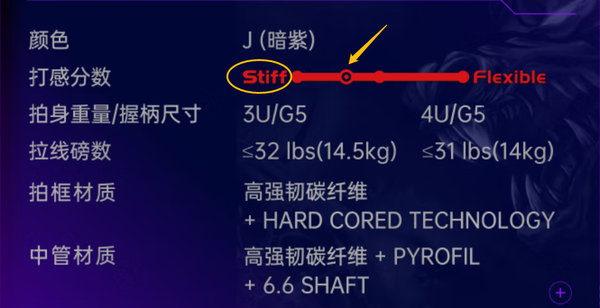英文:Stiff(硬)/Flexible(软),或者直接注明中杆软还是中杆硬。越靠近Stiff硬度越大,越靠近FLEXIBLE,球拍中杆越软。进攻拍中杆硬度大,防守拍硬度小。