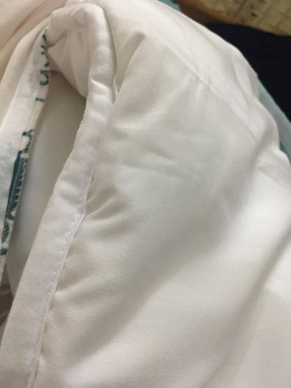 还有被套的面料是亲肤的防羽布,双面花的图案,现实中看不会很俗气,还很紧实耐脏。