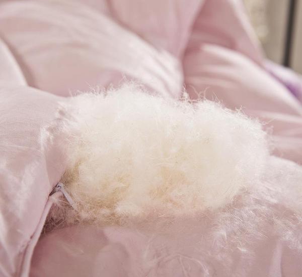 个人总结:属于羽绒材质,是匈牙利进口的白鹅绒,特别的保暖,蓬松度也很高,面料还是亲肤抗菌的。盖在身上一点不会压身子