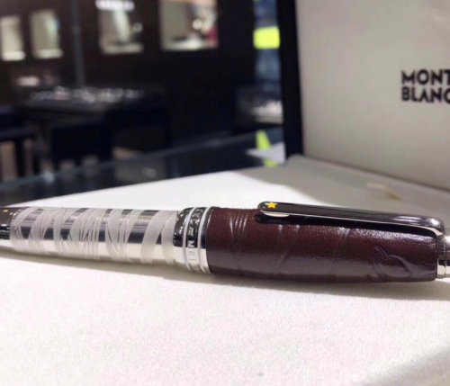 我选的是万宝龙大班系列贵金属系列Doué小王子墨水笔豪华款搭配深棕色皮革笔帽,皮革笔帽上刻有沙漠和飞机图案,镌刻有《小王子》中的名句,并饰有标志性的万宝龙品牌标识。三个镀铂金圆环中的中间圆环饰以万宝龙品牌名称,笔夹饰有一颗黄星,十分别致。这款钢笔配备手工打造的镀铑Au750/18K香槟色镀金笔咀,饰有小王子的羊图案。