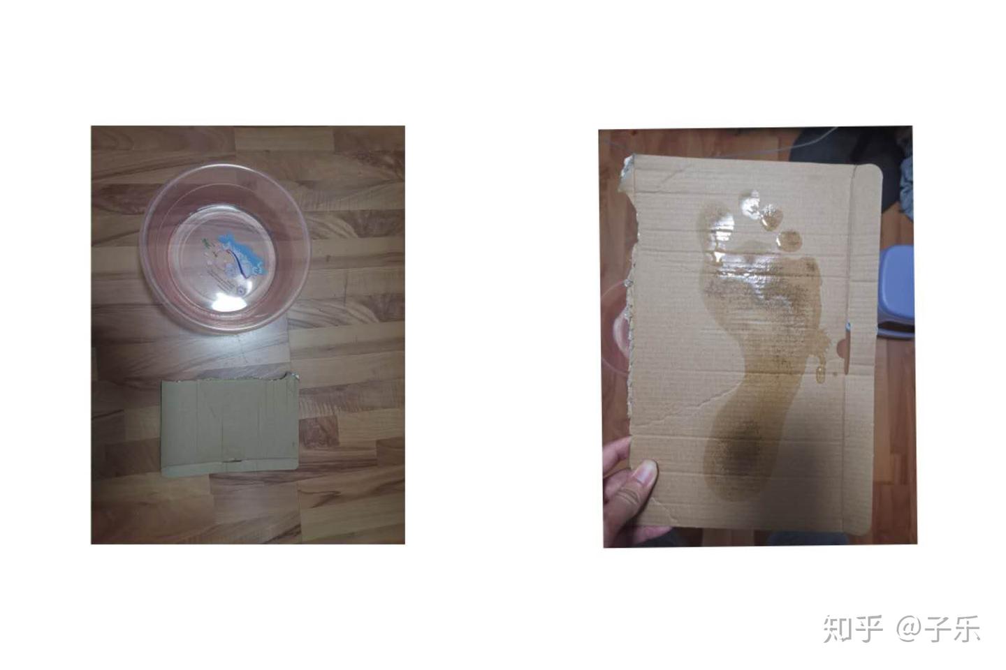 2.把脚弄湿,踩在纸皮上。
