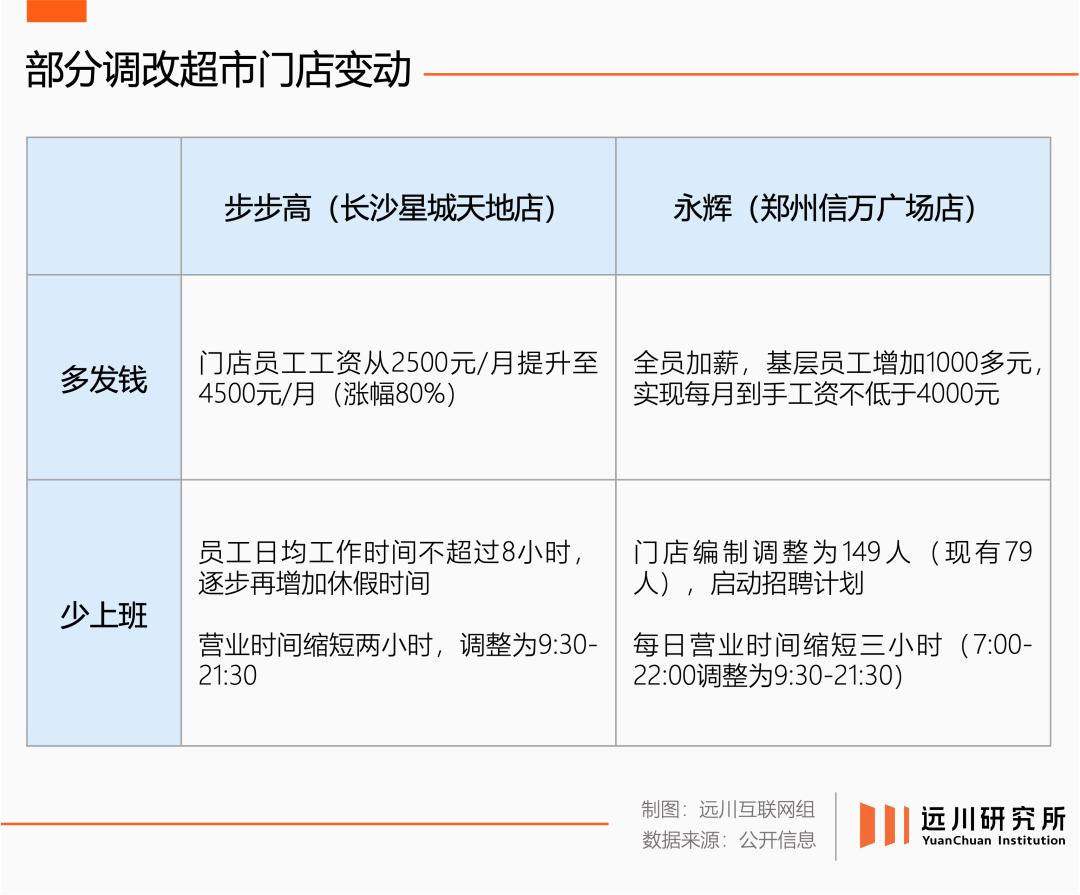 调改后的步步高、永辉门店,门店员工薪酬都涨到了4000元以上;工作量却随着缩短营业时间、门店编制扩招而不增反降。