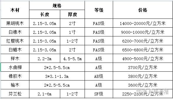 想知道不同木材处于什么样的档次,可以看看它们每立方米的价格,根据价格高低做个排序,大概档次就知道了。