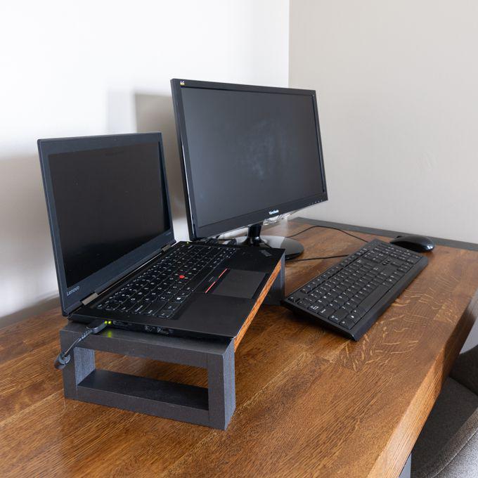 这个漂亮的笔记本电脑支架可以放在桌子上。它架空了笔记本电脑的屏幕,使您可以将键盘和鼠标与笔记本电脑结合使用。它是一个开放式架子,因此您在架子下还将有一些额外的存储空间。